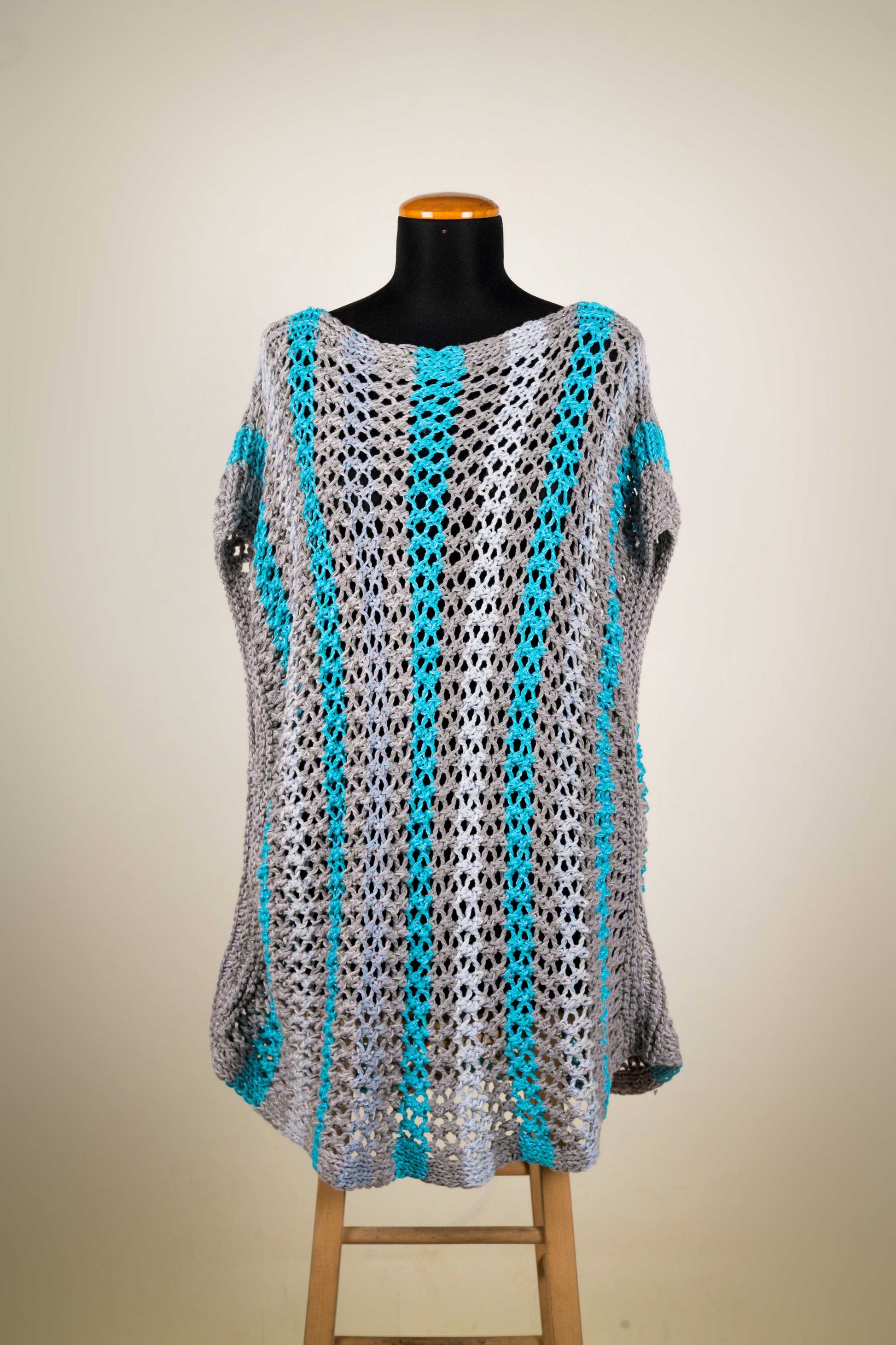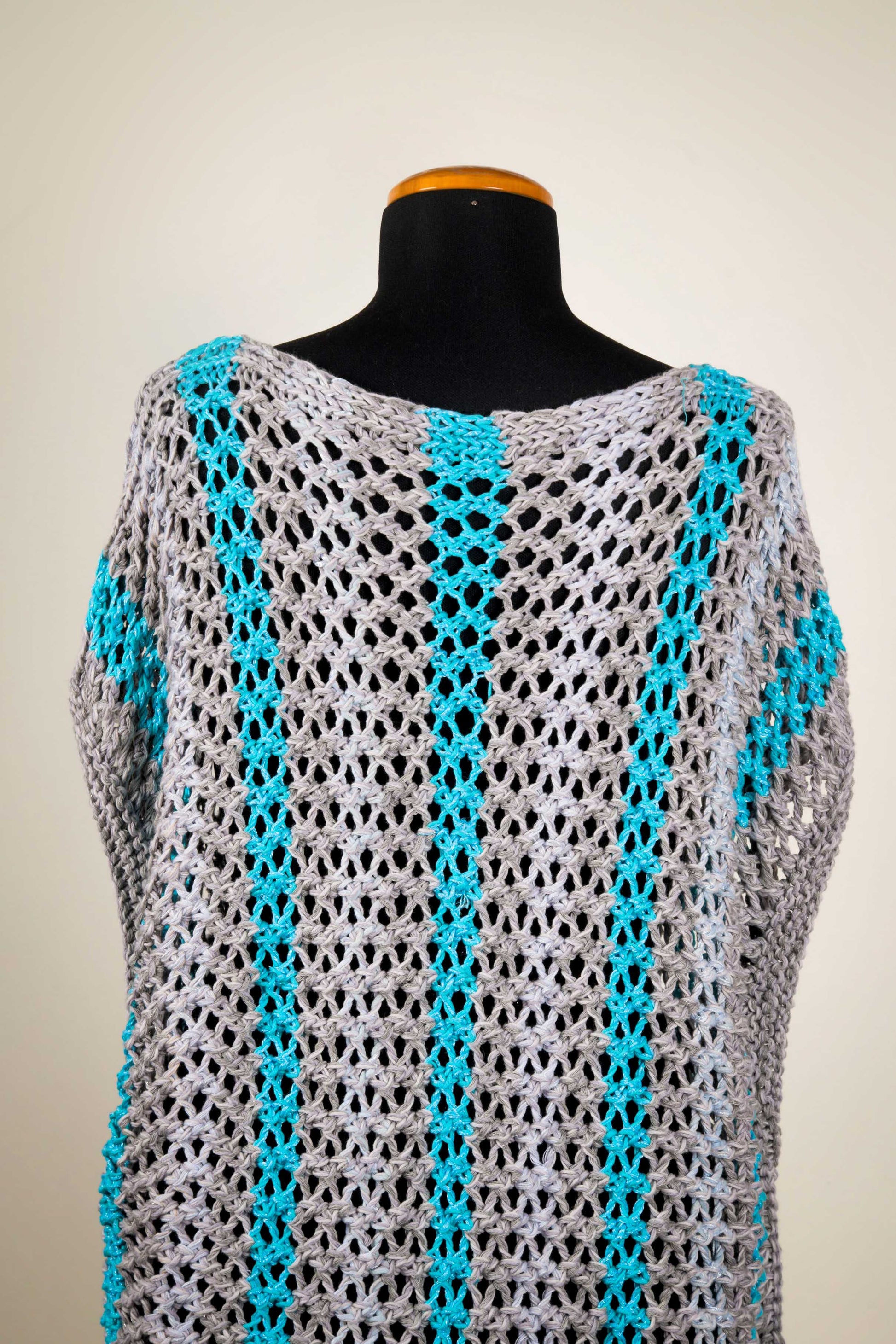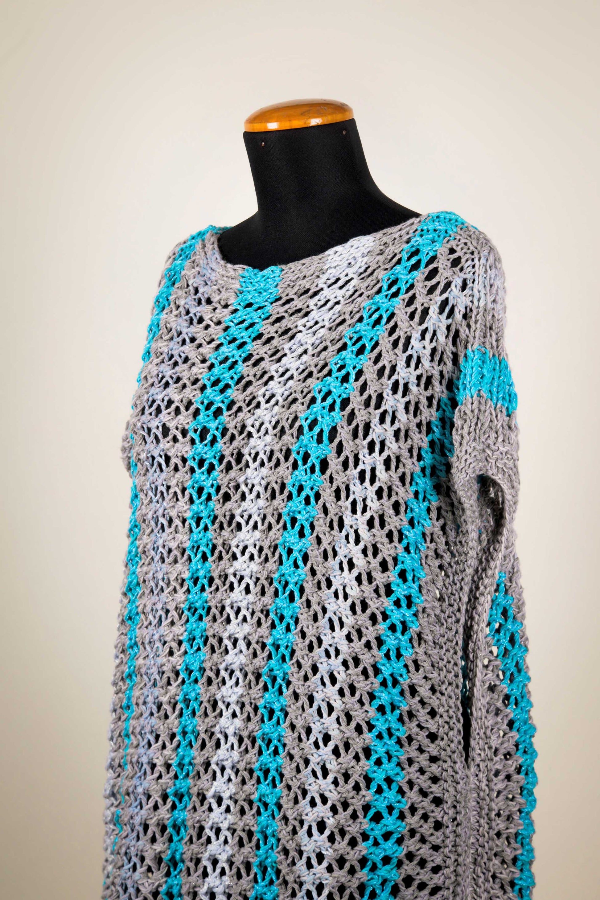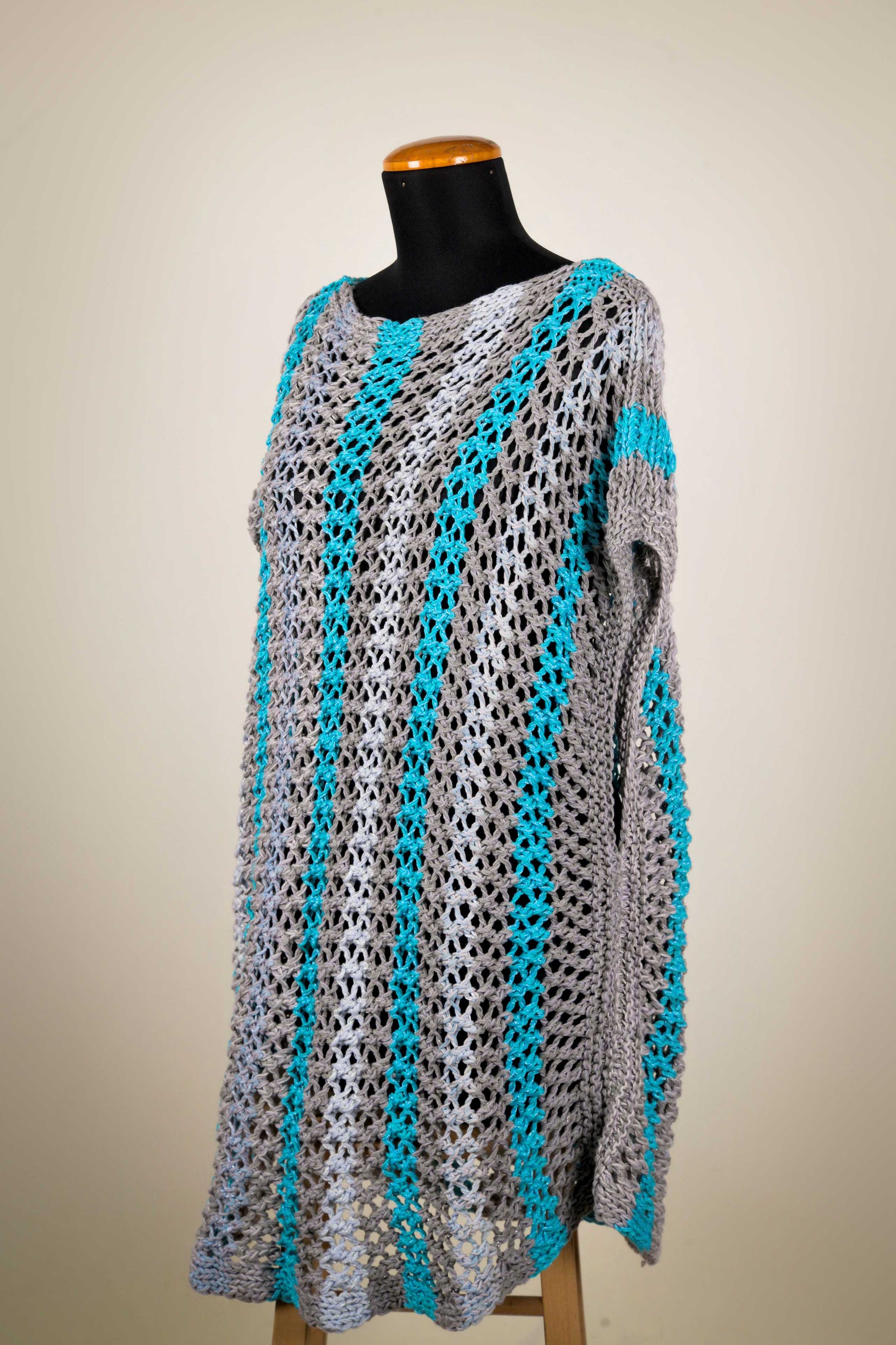 Velomare a righe verticali turchesi e grigie slanciano la figura, e richiamano i colori del mare e della sabbia. Per questo capo abbiamo usato un filato in 100% cotone bio: leggero, morbido e traspirante sulla pelle, che lo rende ideale da indossare in spiaggia, a bordo piscina o durante una passeggiata estiva.
