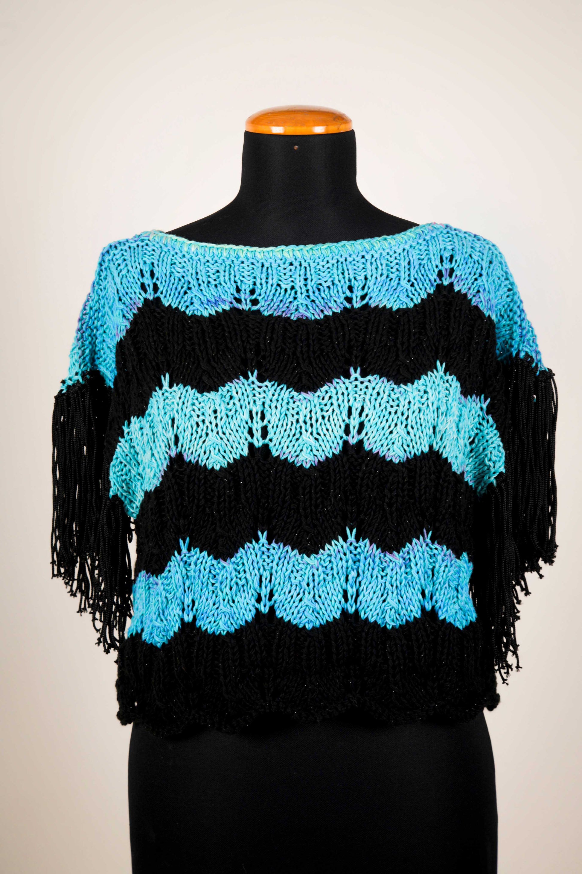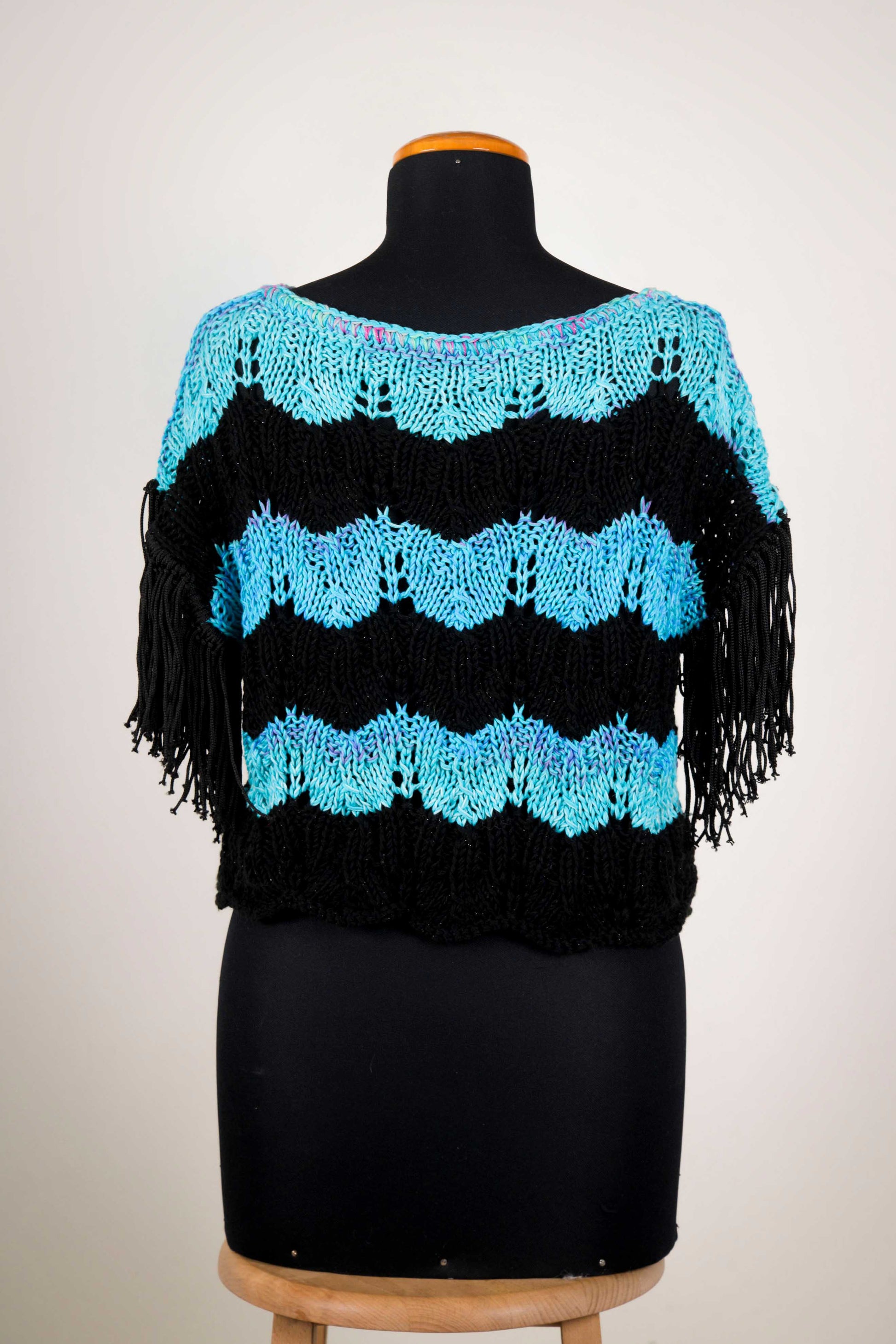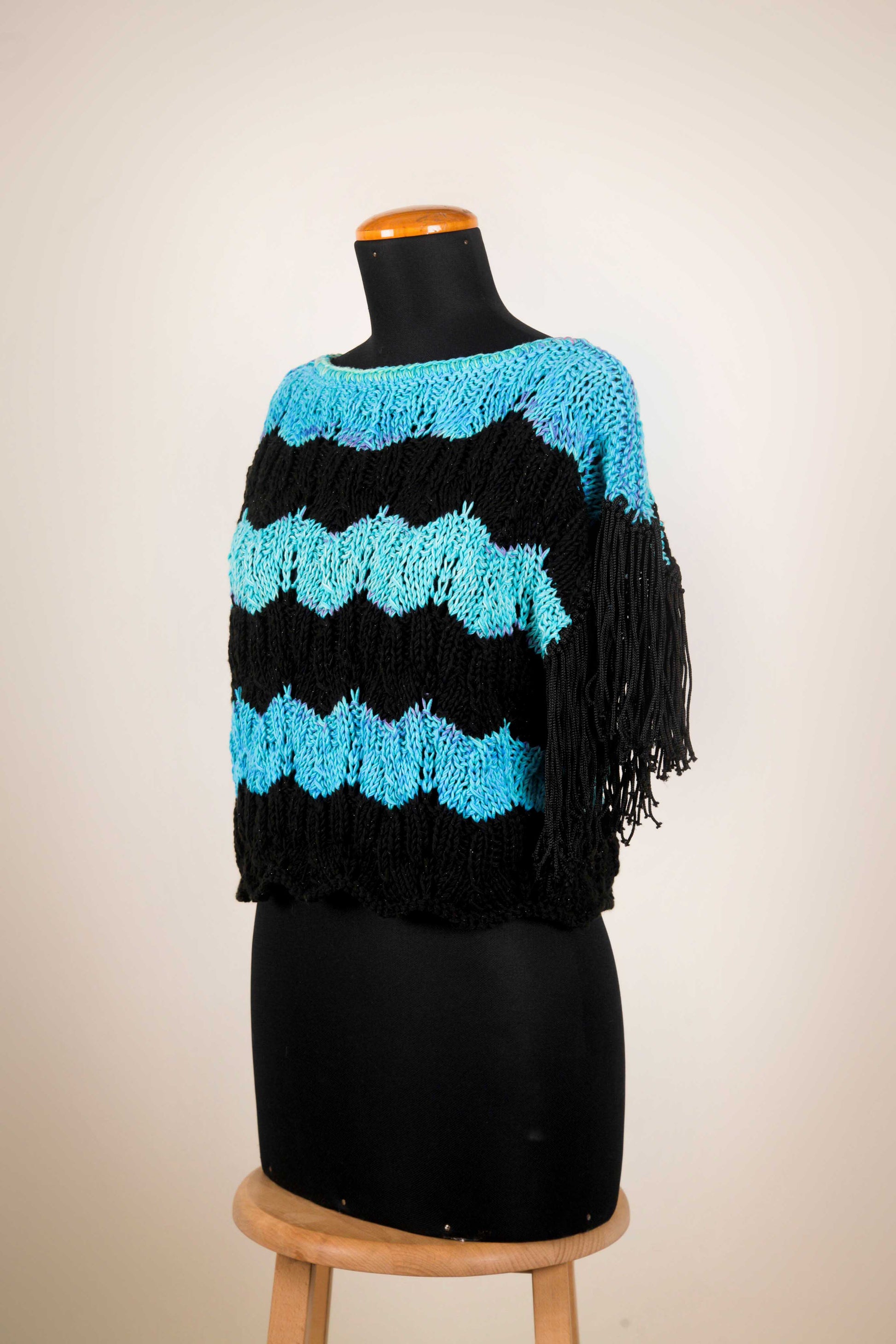 Notte Azzurra a righe orizzontali nelle tonalità del nero profondo e turchese brillante è pensata per chi vuole distinguersi con uno stile audace e contemporaneo. Il taglio morbido la rende comoda e versatile. Per questa maglia abbiamo usato un filato in cotone Batik e microfibra: leggero e di ottima qualità.