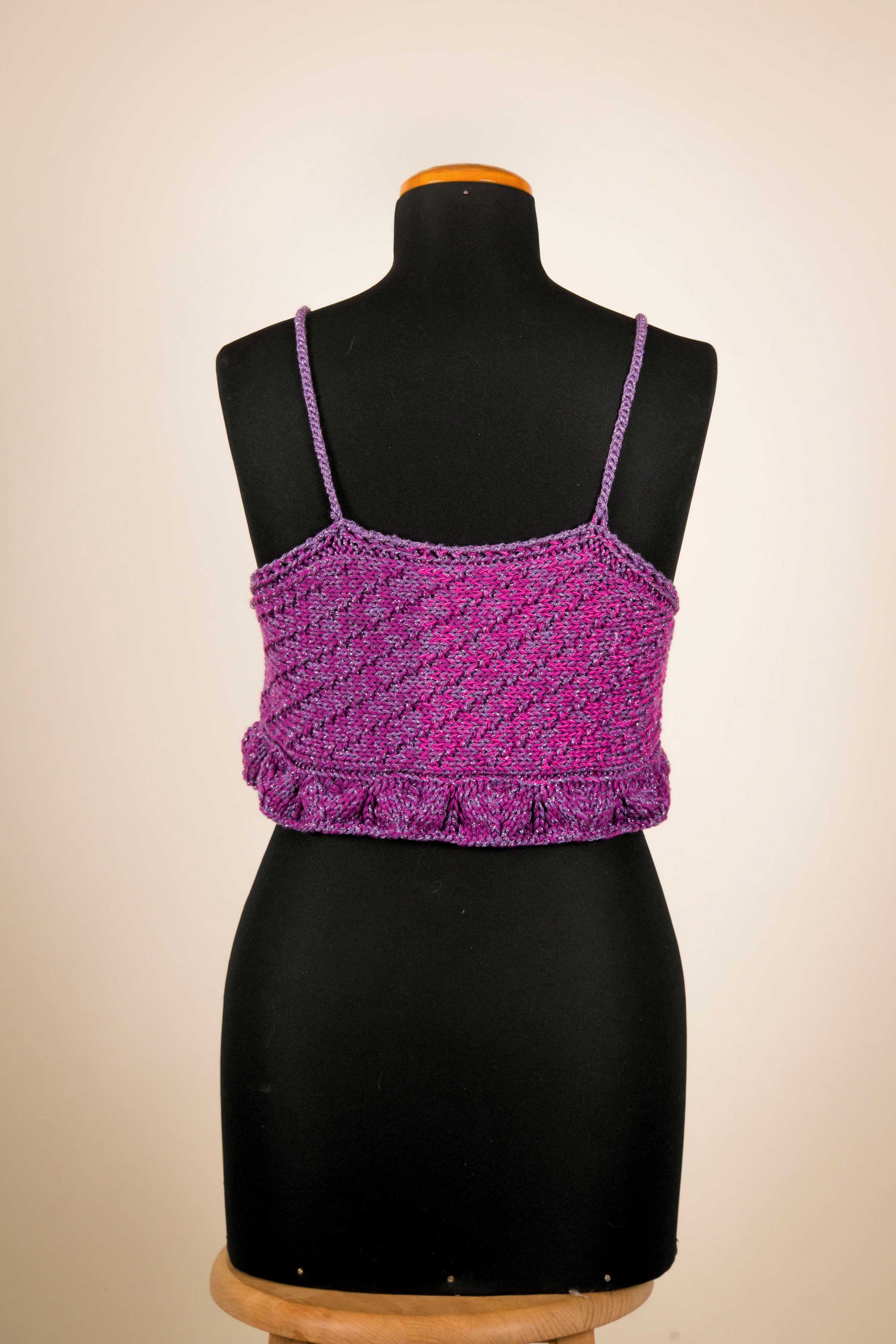 Top Violetta corto con spalline sottili e piccole balze sul fondo, che aggiungono movimento e un tocco sbarazzino al design. Realizzato a mano con filato in microfibra: garantisce una sensazione di freschezza sulla pelle, offrendo comfort e traspirabilità ideali per la stagione calda.